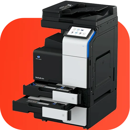 A Konica Minolta bizhub C300i é uma multifuncional laser a cores com 30 páginas por minuto e formato A3. Em renting na FermiPrint por 28€/mês, inclui 1000 cópias a preto, 100 a cores, manutenção preventiva e assistência técnica. O custo por cópia excedente é de 0,0045€ a preto.